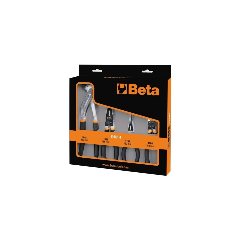 Assortimento di 1 pinza universale, 1 pinza becchi mezzotondi lunghi, 1 tronchese e 1 pinza a cernierachiusa.